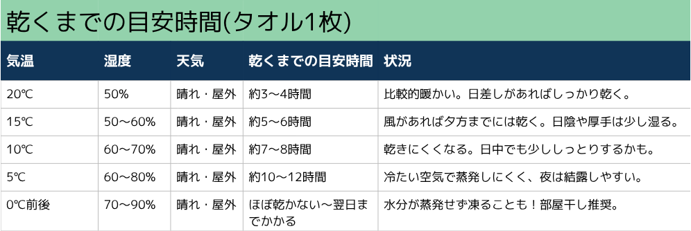 このように、気温と湿度により外干しでも、目安として乾くまでにこんなにも時間がかかってしまうのです….ずっと干しておくのもにおいが気になりますよね。タオル1枚でこれなら、もう厚手の衣類なんてどれだけ時間かかるのか….