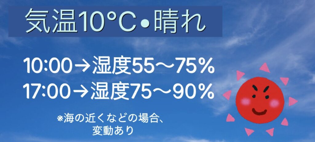 気温10℃で晴れの日の屋外の、10時と17時の平均湿度はこんなにも違います!住んでいる地域の特徴により変動しますが、平均的にこれくらいの差が出るようです。しっかり乾かせる時間帯に、できるだけ外で乾かしておきたいですね♪