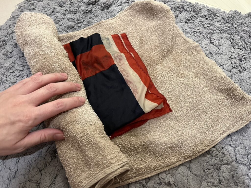スカーフを優しく畳んで、タオルを挟むようにくるくると巻き付けて水分をとっていきます。