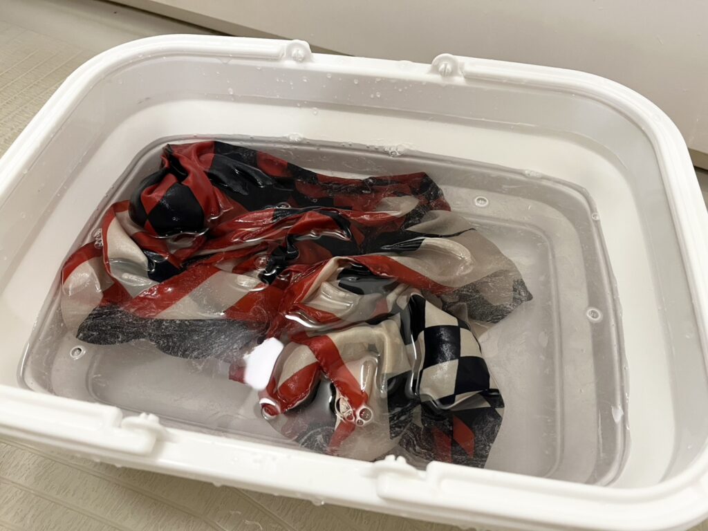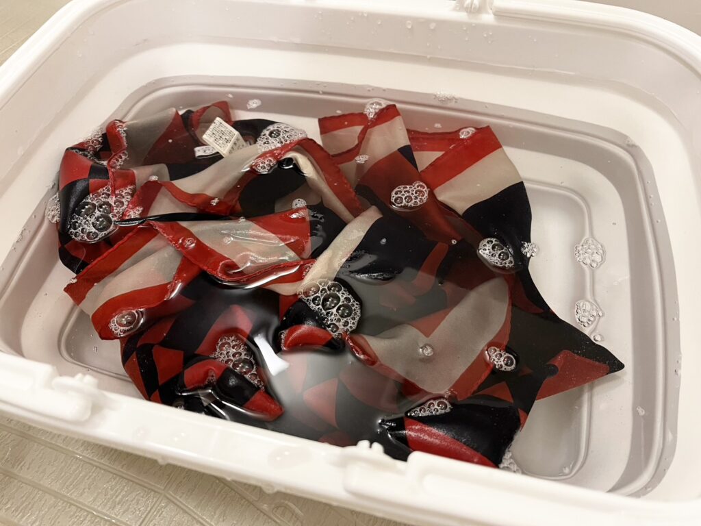 そしてスカーフを入れて、擦ったりせずに2~3分つけおきます。