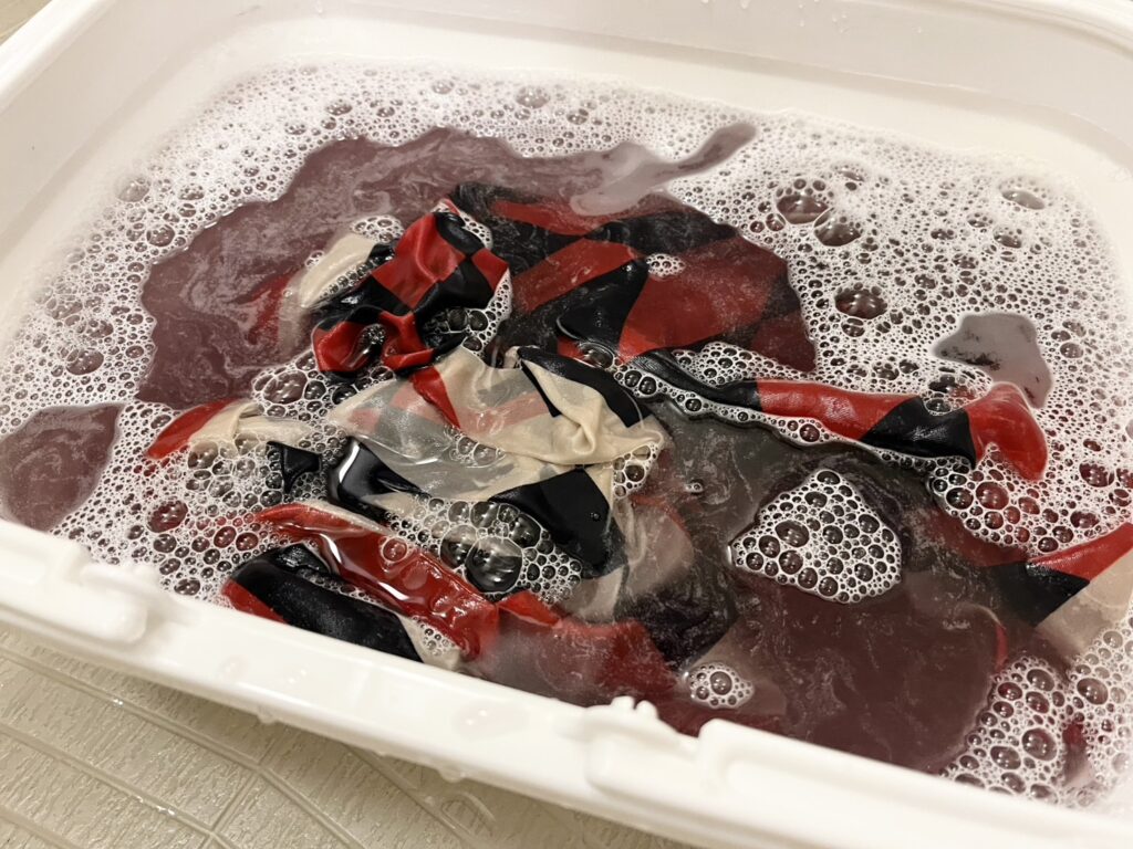暖かめのお湯で洗うと色素が出てしまったりすることもあるので次からは冷水で行こうと思いました・・・!そして、新しい水に替えて洗剤を流していきます♪
